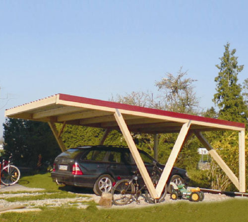 aus Leimholz mit Dachbelag aus verzinktem Stahlblech, Schneelast 170kg/m²durch die Bauart mit zurückgesetzter V-Stütze entsteht mehr Platz zum Rangieren und bequemen Einparken